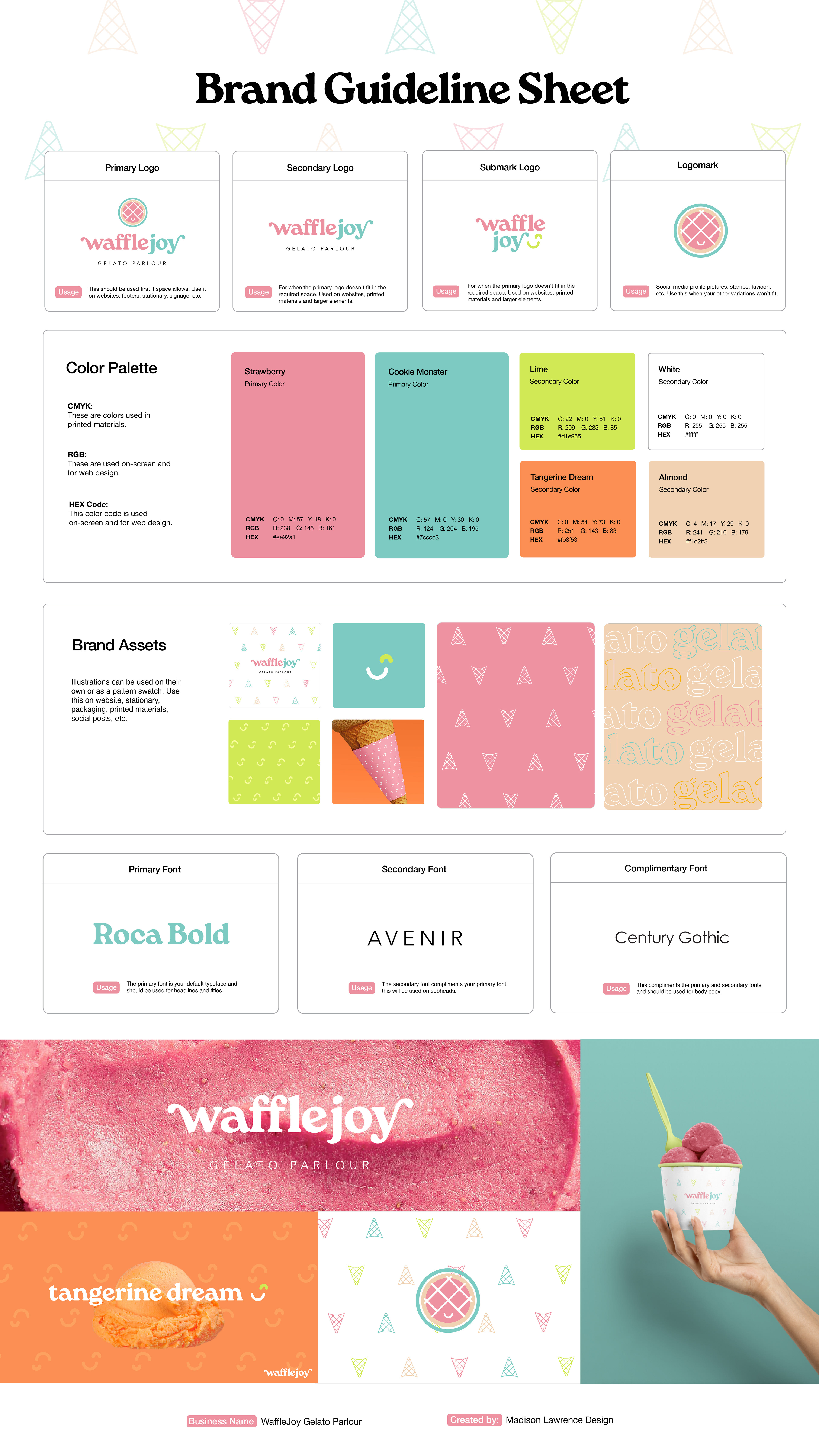 WaffleJoy Gelato is a conceptual brand designed to capture the pure joy and nostalgia of a classic ice cream experience—where fun, youthfulness, and whimsy come together in a modern setting. The visual identity channels the childlike excitement we all associate with ice cream shops, using bright pastel tones, playful typography, and lively, bouncing graphics that feel full of motion and delight.
