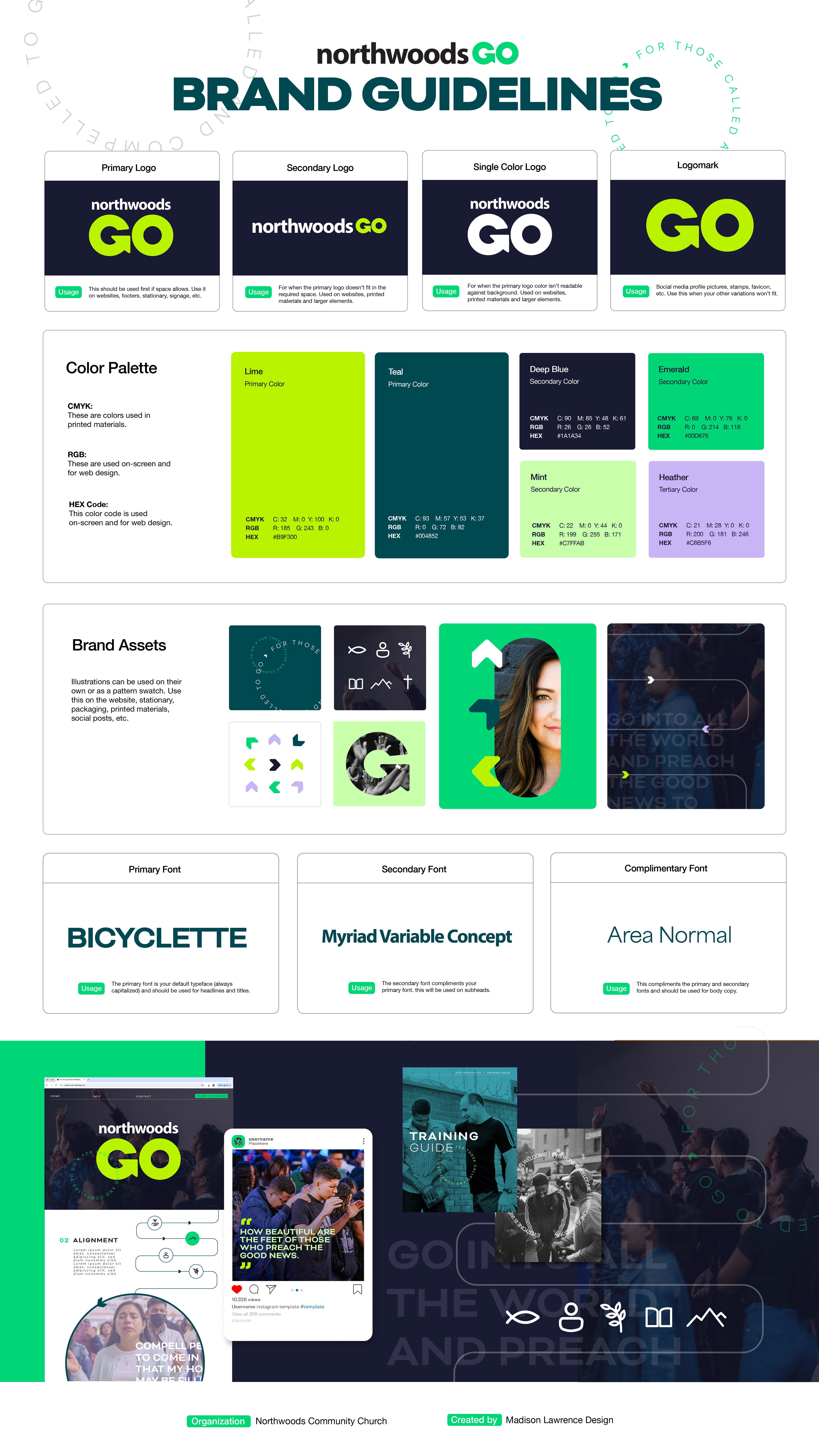 I developed a sister logo for Northwoods Go, along with a complete brand system including color palette, typography, and graphic elements to ensure a cohesive visual identity across social media, the website, and training materials. This foundational work served as a launch pad for other designers within the ministry to expand upon, resulting in a full suite of materials used throughout the church’s outreach efforts.