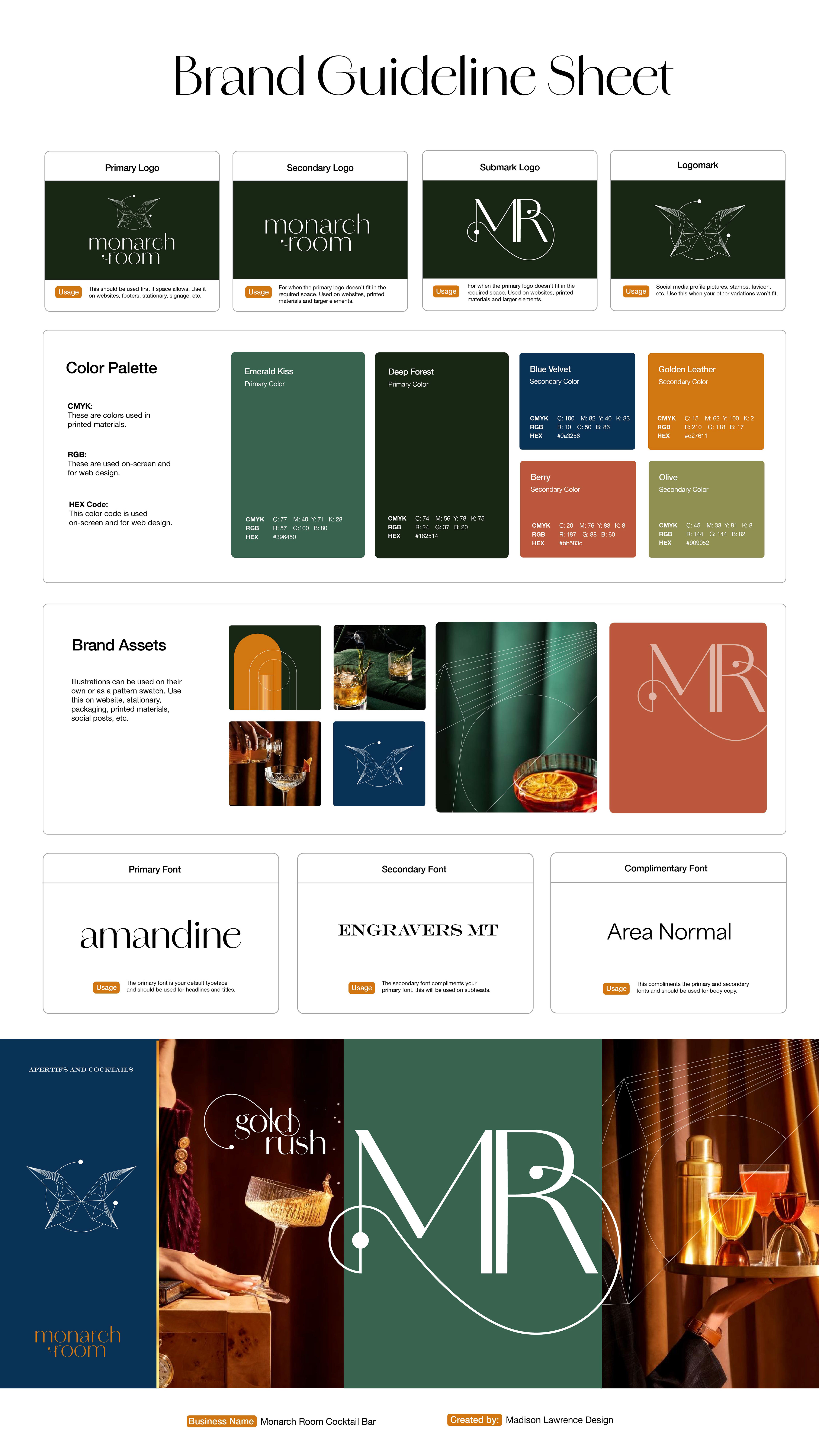 Monarch Room is a conceptual brand that captures the spirit of modern hospitality and the luxury cocktail experience. Rich jewel tones, a balance of geometric and organic curves, and clean, understated typography create an atmosphere that feels both refined and inviting. Vibrant photography highlights the artistry of craft cocktails and the sensory indulgence of the dining experience—celebrating the intersection of flavor, design, and ambiance that defines today’s elevated food and beverage scene.